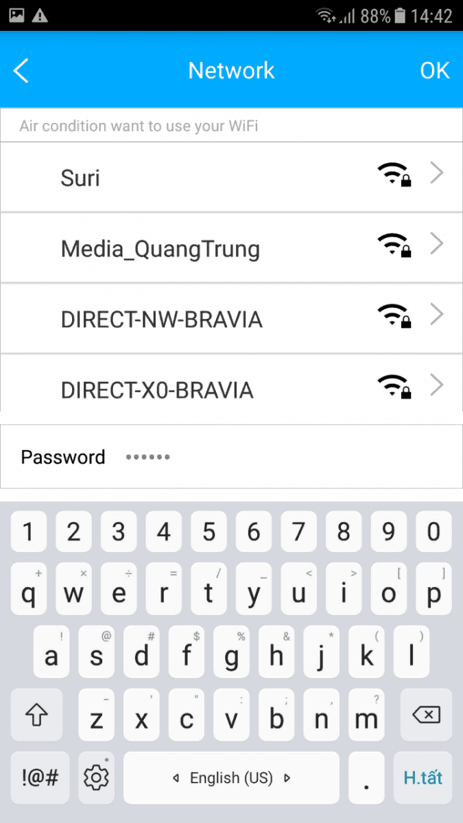 Sau khi quét mã QR xong, sẽ xuất hiện hộp thoại đăng nhập Wifi. Hãy chọn cột wifi muốn kết nối cho điều hòa Midea.