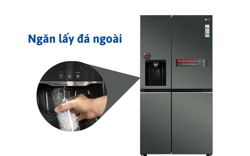 - Tủ lạnh lấy đá bên ngoài: thiết kế hộc lấy đá ở bên ngoài cửa tủ, người dùng chỉ cần nhấn nút trên bảng điều khiển bên ngoài là đá sẽ rơi ra mà không cần mở cửa tủ, hạn chế thất thoát hơi lạnh. Phù hợp cho những ai thường xuyên sử dụng đá để giải khát hoặc nấu nướng. Tính năng nay thường có trên các loại tủ Side by Side hoặc 4 cánh.