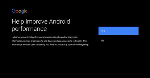 Bước 8 – Trên màn hình Help improve Android performance (Giúp cải thiện hiệu suất của Android), chọn Yes (Đồng ý) để gửi thông tin chẩn đoán lỗi đến Google.