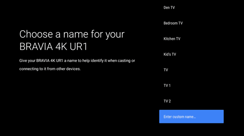 Bước 9 – Khi màn hình Choose a name for your… (Chọn tên cho… của bạn) hiển thị, hãy đặt tên cho Tivi. Chọn tên mong muốn từ danh sách hoặc chọn Enter custom name (Chọn tên tùy chỉnh) và nhập tên.