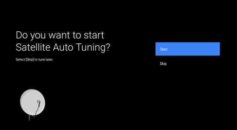 Bước 14 – Bây giờ bạn sẽ có cơ hội dò kênh bằng đầu thu vệ tinh. Hãy chọn Start (Bắt đầu) hoặc Skip (Bỏ qua) quy trình này để dò kênh cho TV sau.
