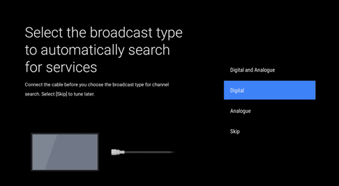 Kết nối cáp Tivi trước khi bạn chọn loại truyền phát cho tìm kiếm kênh và chọn một trong các tùy chọn sau đây: