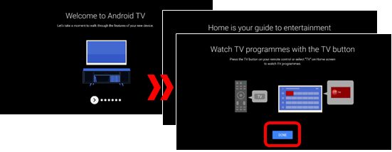 Tùy thuộc vào phiên bản hệ điều hành của Android TV, màn hình giới thiệu (hướng dẫn) về Tivi có thể được hiển thị. Các màn hình sau đây được lấy từ Android 8.0. Nhấn nút mũi tên phải trên điều khiển để tiếp tục, chọn Done (Hoàn tất) trên màn hình cuối cùng và nhấn nút ENTER