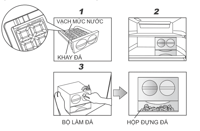 - Không làm đá bằng hộp đựng đá, đổ nước vào hộp đựng đá để làm đá có thể gây vỡ hộp.