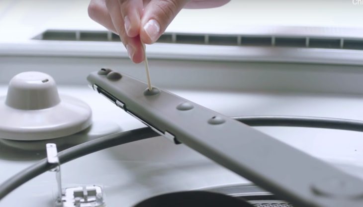 - Khi vệ sinh tay phun, bạn tháo tay phun (cánh quạt phun nước) ra và vệ sinh trong nước xà phòng ấm hoặc giấm pha nước ấm, dùng bàn chải mềm chà nhẹ các lỗ phun nước hoặc dùng tăm để làm thông các lỗ phun bị tắc, sau đó vệ sinh lại với nước sạch rồi lắp lại vào máy.