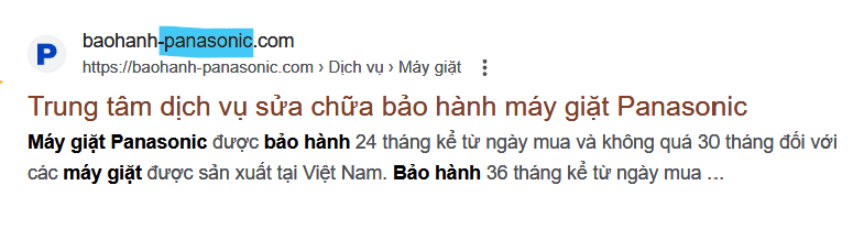 Khi tìm kiếm trên Google.com với dạng từ khóa: trung tâm bảo hành tủ lạnh panasonic, trung tâm bảo hành máy giặt panasonic,… ta sẽ thấy nhiều website có tên miền (domain) gồm “panasonic” bên trong, logo website có chữ P như hãng Panasonic: