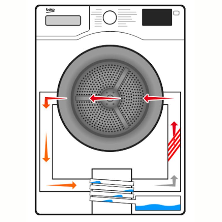 Trong môi trường áp suất cao, máy nén sử dụng gas để tạo ra luồng khí nóng và thổi vào lồng sấy. Luồng khí nóng có nhiệm vụ lấy hơi ẩm từ quần áo, biến thành những luồng khí nóng ẩm và được làm mát ngay tại lồng sấy. Lúc này, hơi ẩm sẽ được ngưng tụ thành nước để đẩy lên hộp chứa phía trên, còn phần luồng khí sẽ tiếp tục tuần hoàn, được làm nóng và thổi vào lồng sấy.