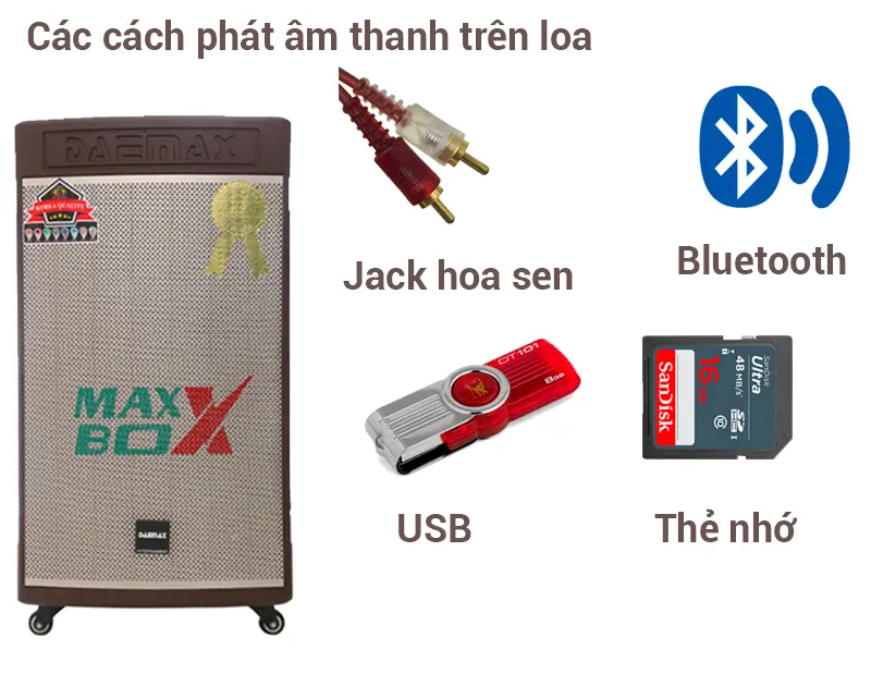 Loa kéo Daemax được tích hợp tất cả các chức năng của dàn karaoke di động. Loa còn có thể tương thích với nhiều thiết bị khác nhau như: điện thoại, máy tính bảng, laptop, tivi qua jack hoa sen. Loa còn có hỗ trợ nghe FM Radio, nghe nhạc qua USB, thẻ nhớ SD.
