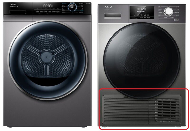 Con AQUA 10kg bên trái không có cửa tháo ra vệ sinh dàn ngưng tụ như con 9kg bên phải