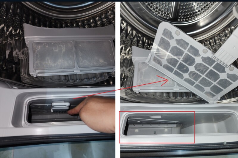 Khi vệ sinh máy sấy heatpump thì chúng ta thường vệ sinh 3 khu vực: Hộp chứa nước, Túi lọc xơ vải và kiểm tra xơ vải có bám tại khu vực dàn ngưng tụ nước không.