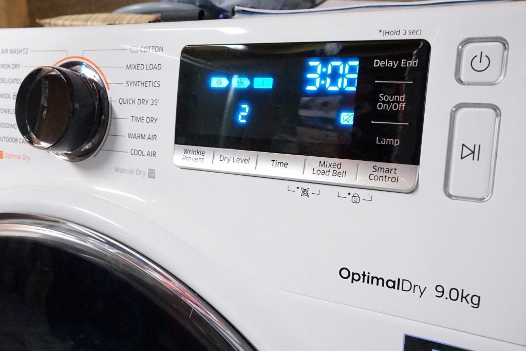 Chúng tôi đặt độ khô ở Mức 2 trên chương trình Cotton. Màn hình cho biết thời gian chạy tối đa là ba giờ tám phút. Chỉ hai tiếng rưỡi sau, thông báo ‘load end’ hiện lên.
