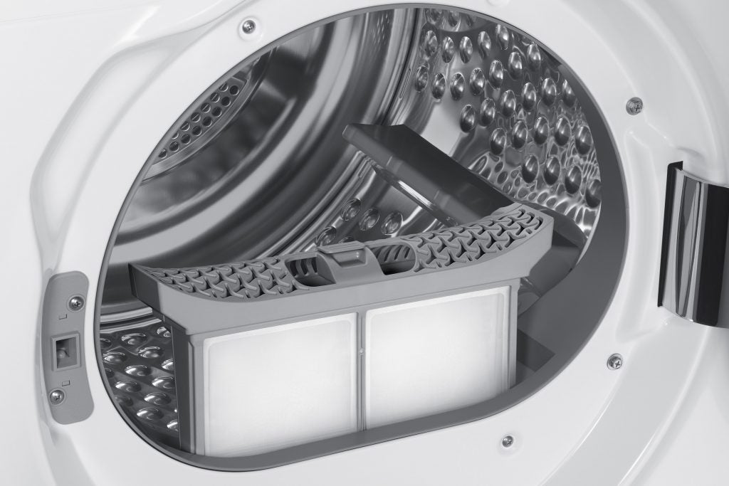 Đằng sau cánh cửa lớn, tinh vi, màu đen đó là một cái thùng rỗng với hệ thống đèn LED. Bộ lọc chính ngay bên trong cửa là hệ thống kép của Electrolux, sử dụng lưới mịn hơn bên trong lưới thô hơn bên ngoài. Kết quả cuối cùng là chỉ có một bộ lọc để làm sạch giữa các lần sấy khô. Hầu hết các đối thủ cạnh tranh đều có một bộ lọc ở cửa và một bộ lọc khác ở phía dưới, ở bình ngưng.