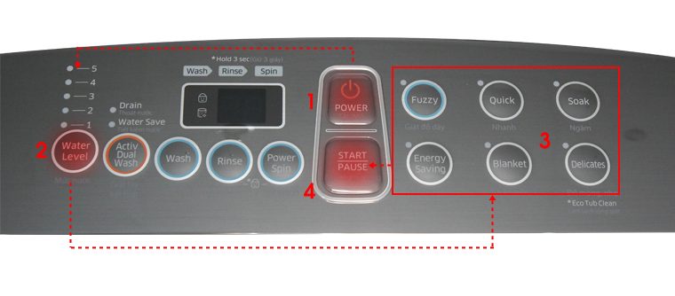 Bước 6: Bấm nút Start/Pause (Bắt đầu/Tạm dừng) để bắt đầu quá trình giặt.