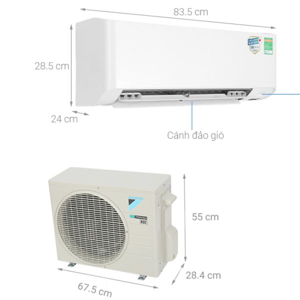 - Kích thước dàn lạnh: Dài 83.5 cm – Cao 28.5 cm – Dày 24 cm