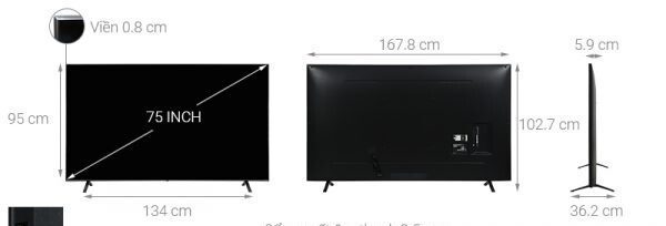 - Độ dài đường chéo màn hình: 75 inch = 190,5cm