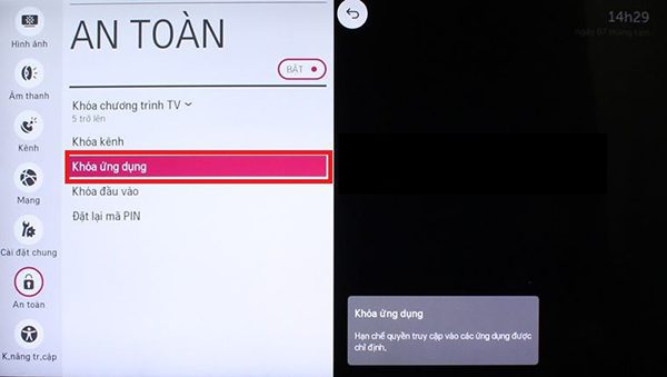 Bước 4: Chọn mục An toàn, mục này ta sẽ thiết lập các nội dung mà tivi cho phép khóa như khóa chương trình, kênh, ứng dụng,…