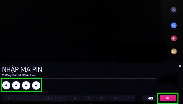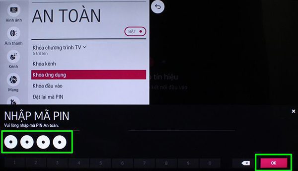 Bước 6: Sau khi chọn nội dung cần khóa thì tivi sẽ yêu cầu ta nhập mã PIN. Mã PIN mặc định của máy nếu như chưa thay đổi là 0000, sau khi nhập xong chọn OK.