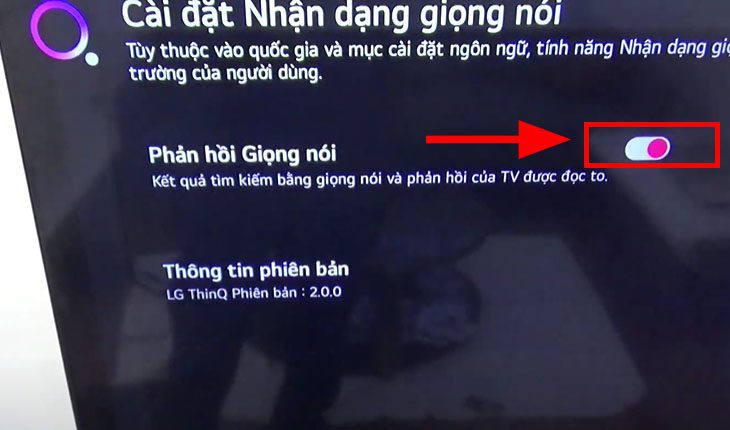 Bạn chỉ cần di chuyển con trỏ tới chấm tròn màu hồng trên màn hình tivi và nhấn vào nó. Lúc này chấm tròn sẽ trượt sang bên trái và chuyển thành màu xám, đồng nghĩa với việc đã tắt phản hồi giọng nói trên tivi.