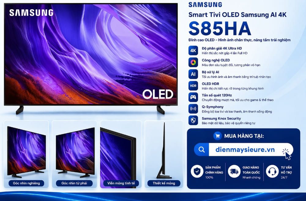 Trong giới công nghệ truyền hình, OLED luôn được coi là “chén thánh” của chất lượng hiển thị. Với sự ra mắt của Smart Tivi OLED Samsung AI 4K 55 inch QA55S85HA, Samsung đã khẳng định vị thế dẫn đầu bằng việc kết hợp hoàn hảo giữa các điểm ảnh tự phát sáng và trí tuệ nhân tạo AI.