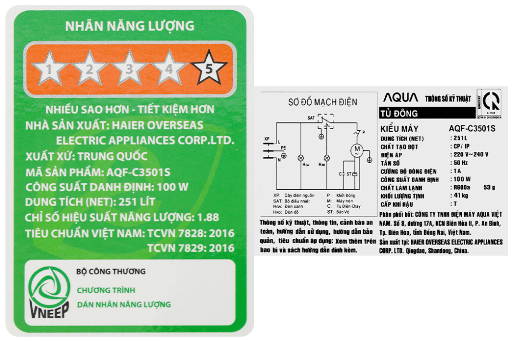 Tủ đông Aqua 200 lít, 300 lít có điện năng tiêu thụ khoảng 0,75 ~ 1,12 kWh/ngày.